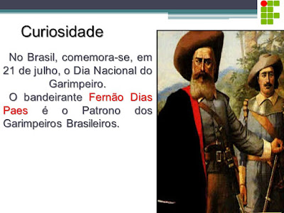 No dia 21 de julho foi instituído como o Dia Nacional do Garimpeiro comemoração do Brasil, conforme LEI Nº 11.685 DE 2 de junho de 2008, pela qual também se instituiu o Estatuto dos Garimpeiros brasileiros, e se intitulou o Bandeirante paulista, Fernão Dias Paes Leme, como Patrono dos Garimpeiros do Brasil, para uma data comemorativa que já vinha de alguma forma sendo festejada desde 1973 por brasileiros, com o fim de marcar a data da Partida da bandeira do explorador Bandeirante brasileiro de São Paulo, Fernão Dias Paes Leime [também conhecido como "O Caçador de Esmeraldas"],